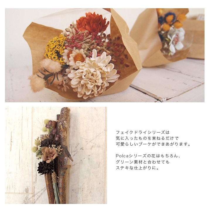 そのまま束ねてブーケにしたり、ハーバリウムやカレイドフレームの材料としてなど、さまざまなクラフト・ハンドメイドにお使いいただけるフェイクドライフラワーです。