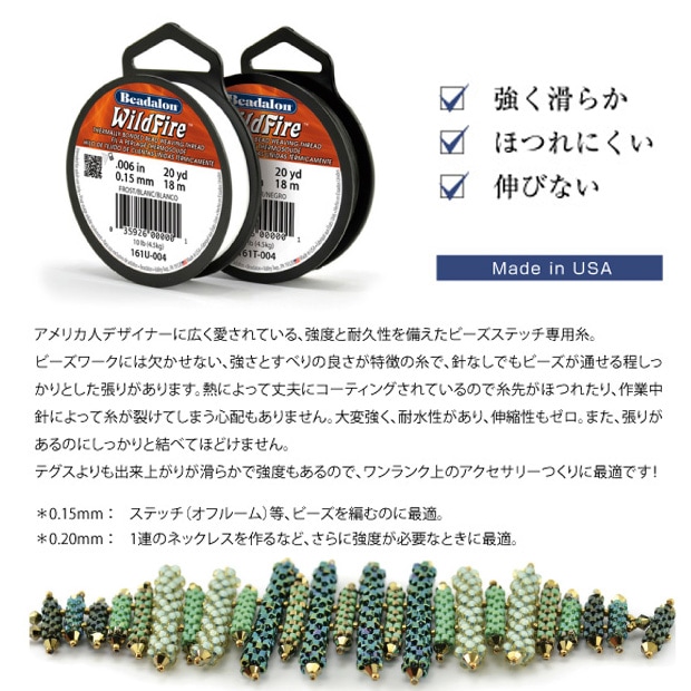 強さとすべりの良さが特徴の糸で、針なしでもビーズが通せるほどしっかりとしたハリがあります。