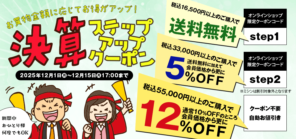 | ご注文手続きの際に、下記のクーポンコードをご入力ください。 クーポンコードは下のテキストをコピーできます。ご利用ください。 (ミシンは割引対象外・お一人様期間中何度でもOK・実店舗でのご利用不可) (まとめ買いご購入時・55,000円以上ご購入時は、5%OFFのクーポンは使えません) (ご利用期間:2025年12月15日(月)17時まで) |